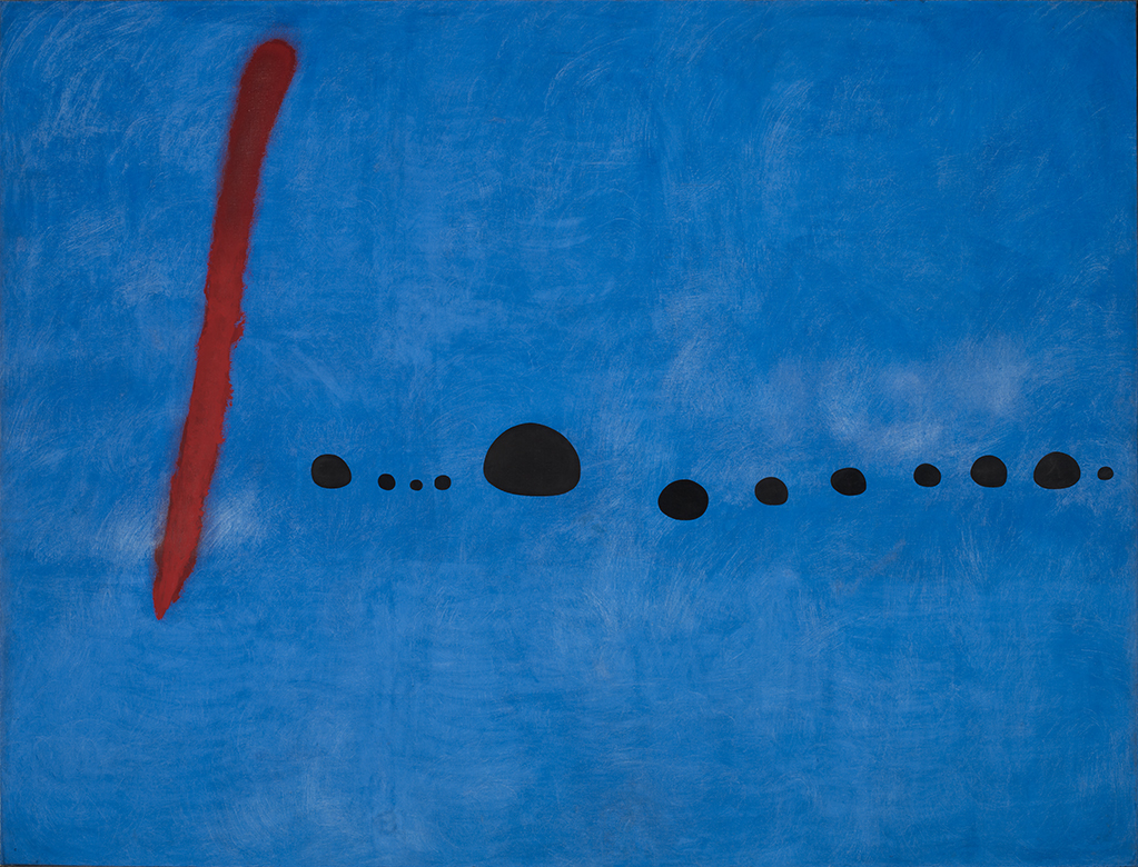Across the surface runs a sequence of black dots of varying sizes, alongside a single vertical red line. The composition, seemingly simple, is precisely calibrated: the dots establish rhythm and visual cadence, while the red line introduces contrast. Miró achieves a remarkable expressive intensity, culminating his search for the essential—colour as pure emotion and the sign as a universal language.