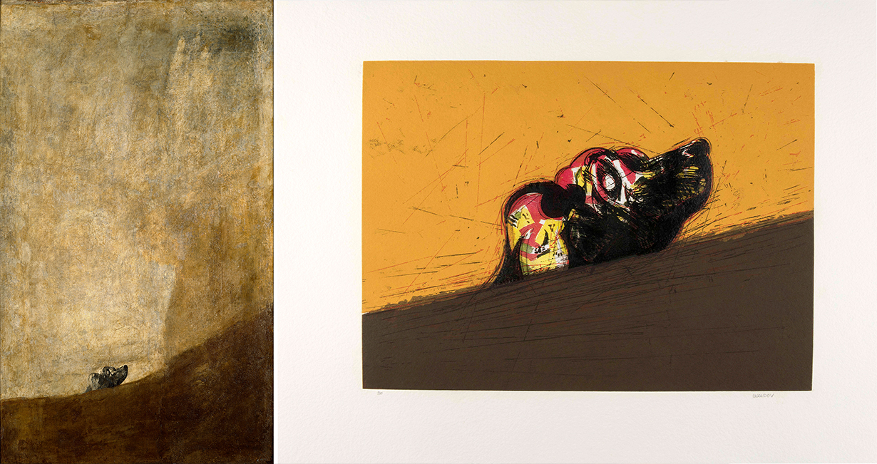 Dcha.: Dog V, 2008 de Manolo Valdés. Grabado y collage, 57 × 74 cm. Ed. 50. Coedición ARTIKA-Manolo Valdés