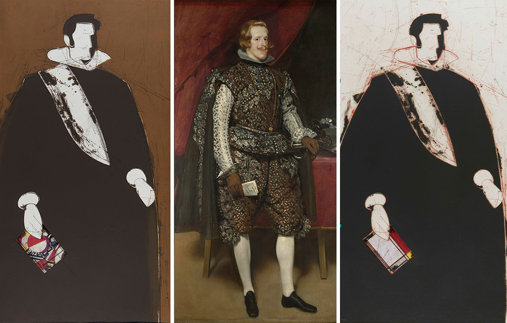 Valdés transforma intencionadamente la vestimenta en un elemento plano y reduce las manos a una mancha elíptica para subrayar el poderío del personaje. El libro, recreado en collage, varía de un cuadro a otro, ya que aporta un toque de color y lo enlaza directamente con la Historia del Arte. En esta paráfrasis de Velázquez, Valdés preserva la sobriedad y la elegancia del negro, ya sea en la ropa o en el fondo, reforzando la expresión impasible del rey, que continúa transmitiendo intacto su poder.